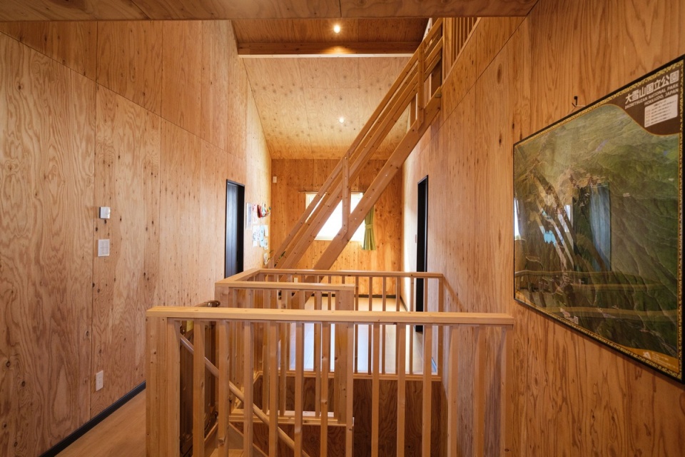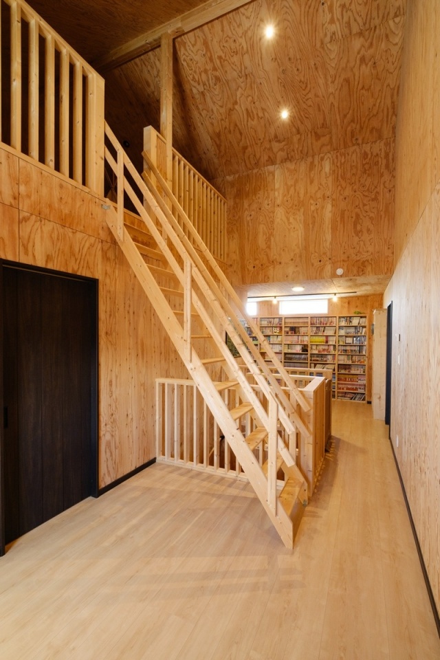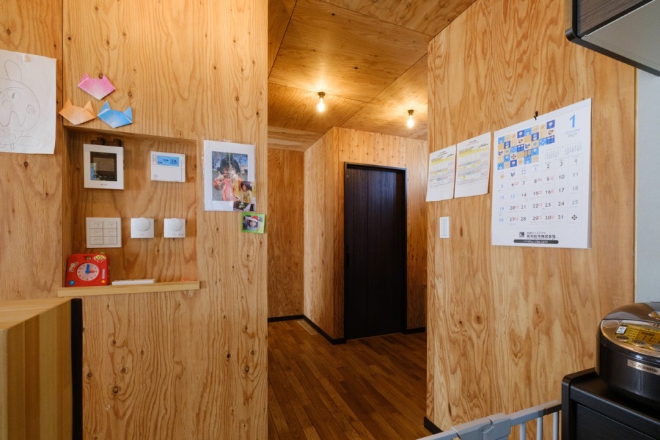 床はナラ材、壁と天井はカラマツの針葉樹合板、土間部分の天井にはOSB合板を使っています。