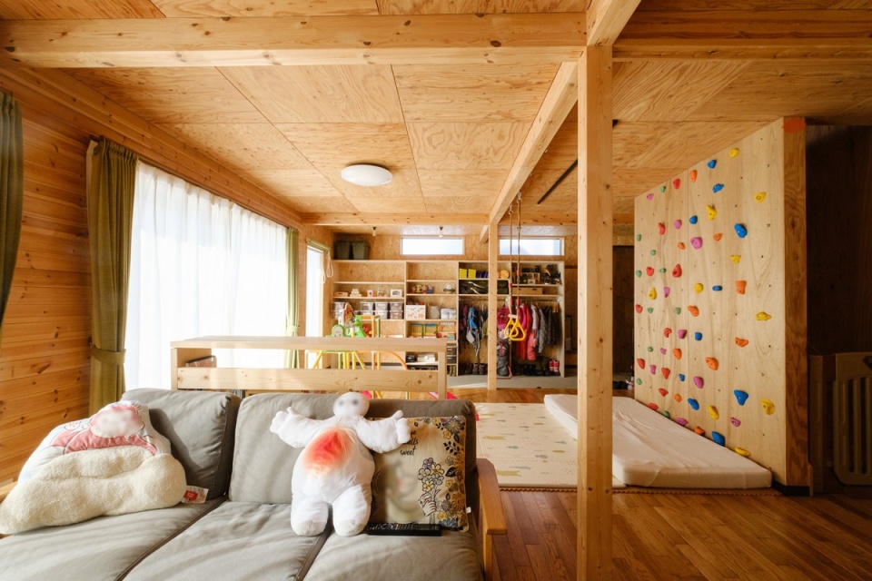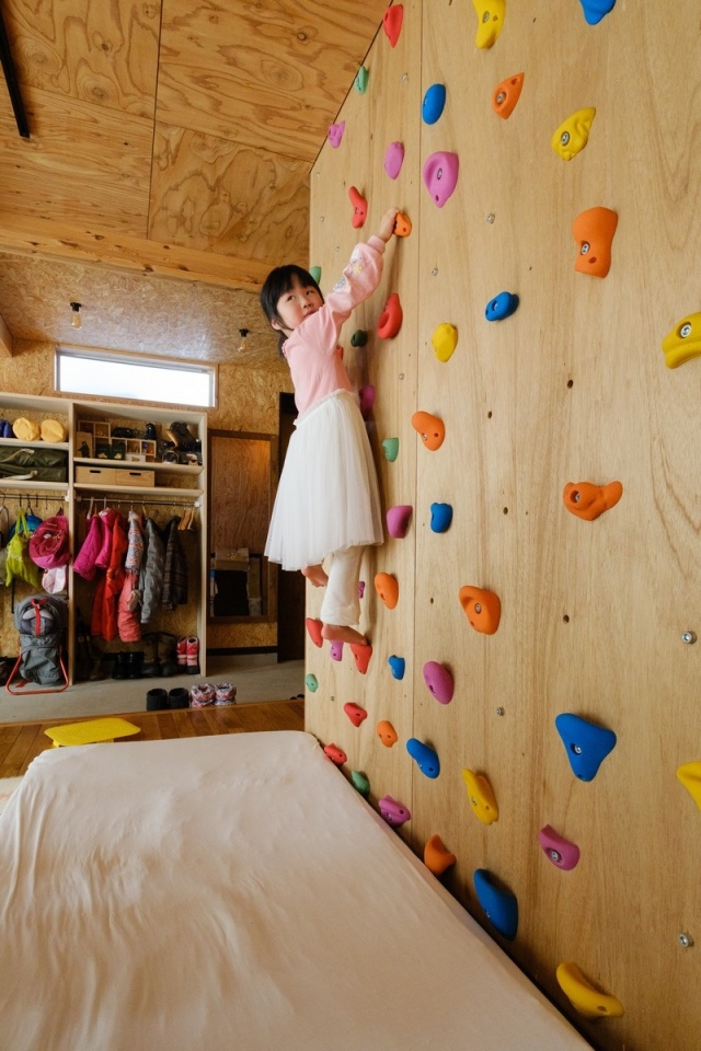 リビング側の階段室壁につくったクライミングウォール。娘さんはすいすいと上手に登っていきます。