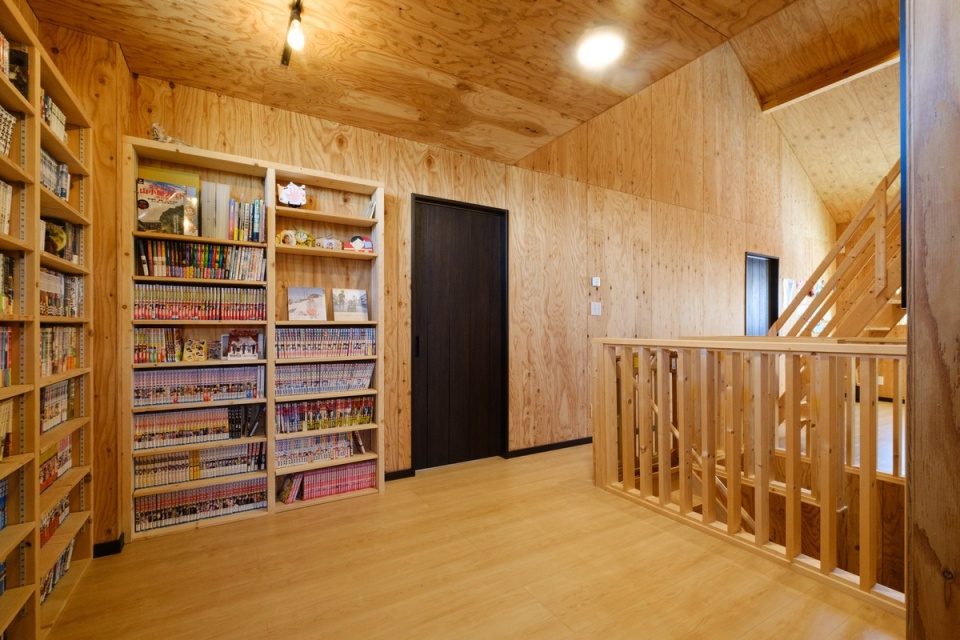 ホールの一角はブックスペースになっています。壁一面の造作本棚も、山小屋のイメージです。