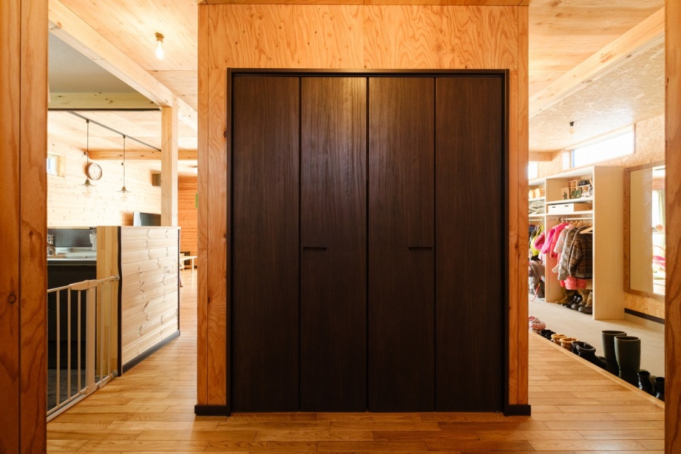 写真正面は収納で、裏側は階段室になっています。収納と階段を中心に、土間、洗面室、キッチン、リビングを回遊できるように配しました。「子どもたちは、汗だくになるまで追いかけっこをしています」と夫妻は笑います。
