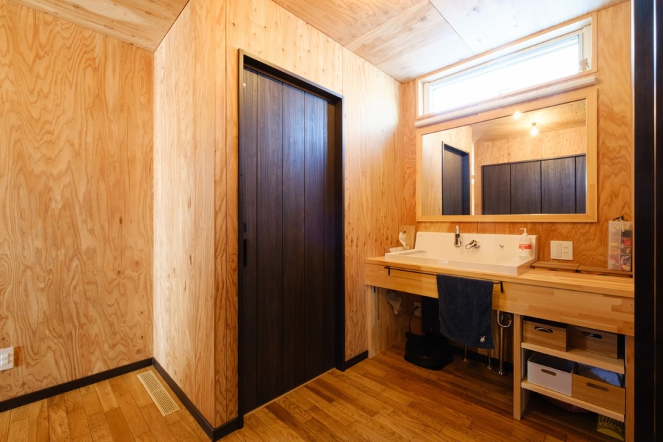 玄関土間からつながる洗面スペース。左手にはトイレがあります。洗面ボウルにINAXを採用した造作で、大きな鏡はTさんが用意したものです。