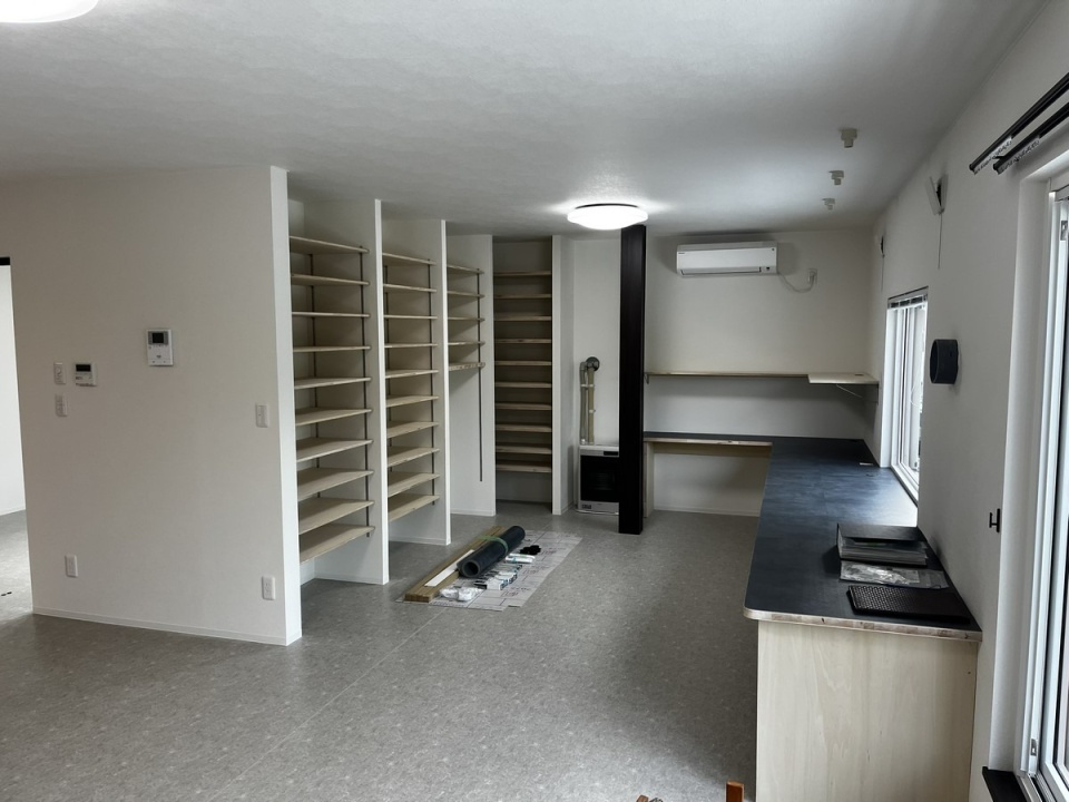 1階の大空間のうち、南側の半分のスペースに、長さ約5メートルの作業台と収納棚をたくさん設けた「プロダクションルーム」を作りました。