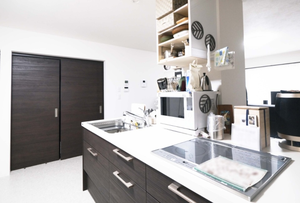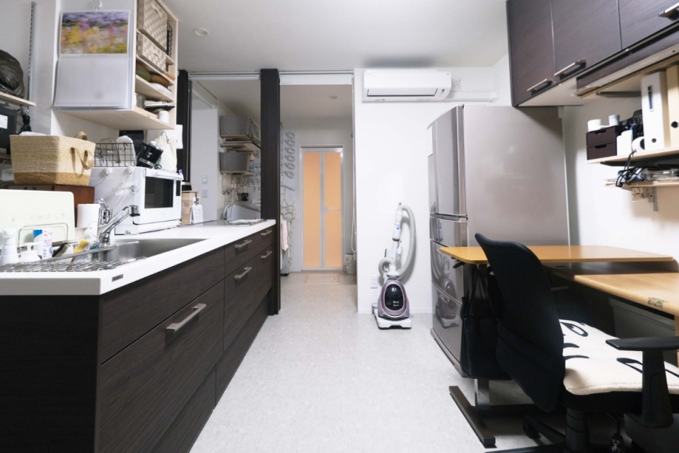 「キッチン自体に備わっている収納と小さな食器棚、デスク上の吊り戸棚だけで十分な収納力があります。収納力を増やさず、終活を意識して余分な食器や調理器具、趣味のものなどを思い切って処分しました」と奥さま。