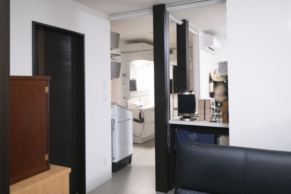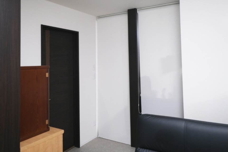 1階は大きなワンルームにしたため、玄関からリビングに入ると脱衣室やキッチンが丸見えになります。そこでロールスクリーンで視線を遮る対応をしました。