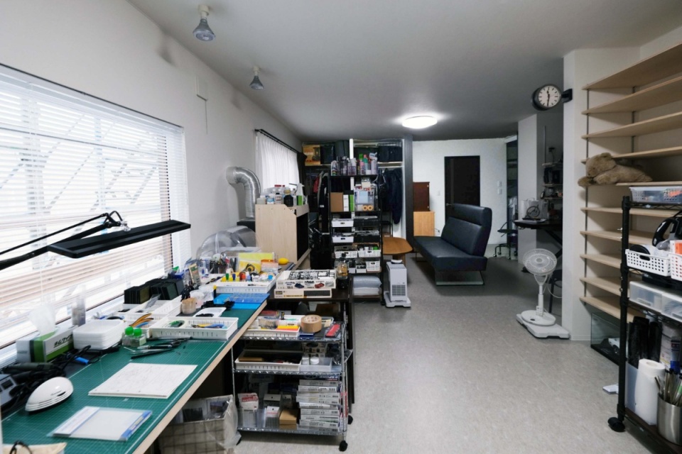 趣味関連の書籍や、作った模型などを陳列できるよう、棚の高さ、幅などは細かく検討しました。