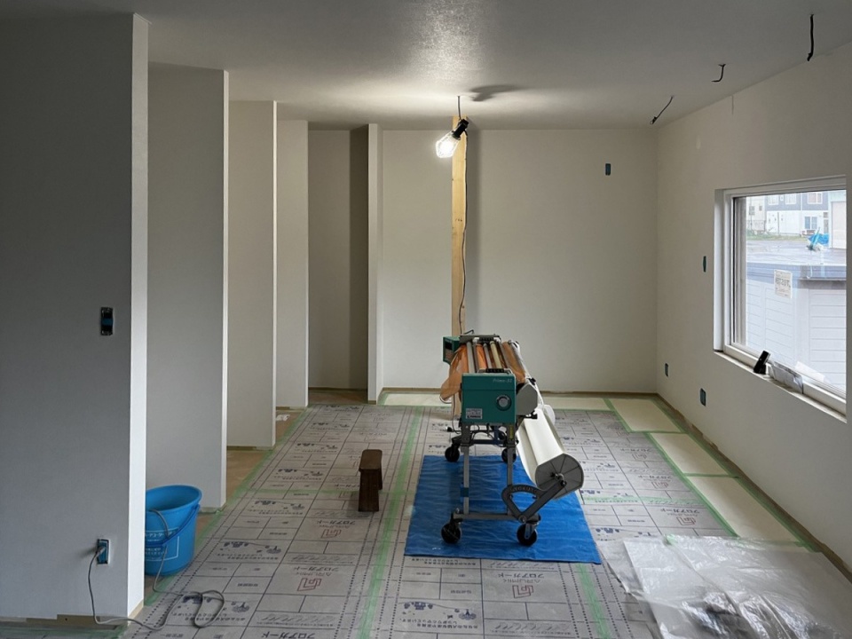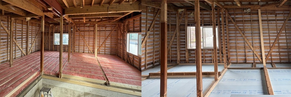リノベーションはまず構造躯体の改修から始まりました。一階の床下は高性能グラスウール150ミリとスタイロフォーム30ミリ、壁は高性能グラスウール100ミリ、小屋裏は吹き込み断熱300ミリ(ブローイング)を施工しました。