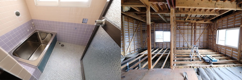 基礎や柱、梁など構造躯体は状態が良かったのでそのまま活かし、劣化が進んでいた床、壁、キッチンや浴室、トイレなどの設備や、水道管などを新しくしました。