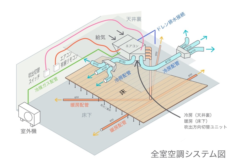 夏は天井から冷気を届け、冬は暖気を床下空間へと送り込み、足元から家全体を暖める仕組みです。暖房としてパネルヒーターも備えています。