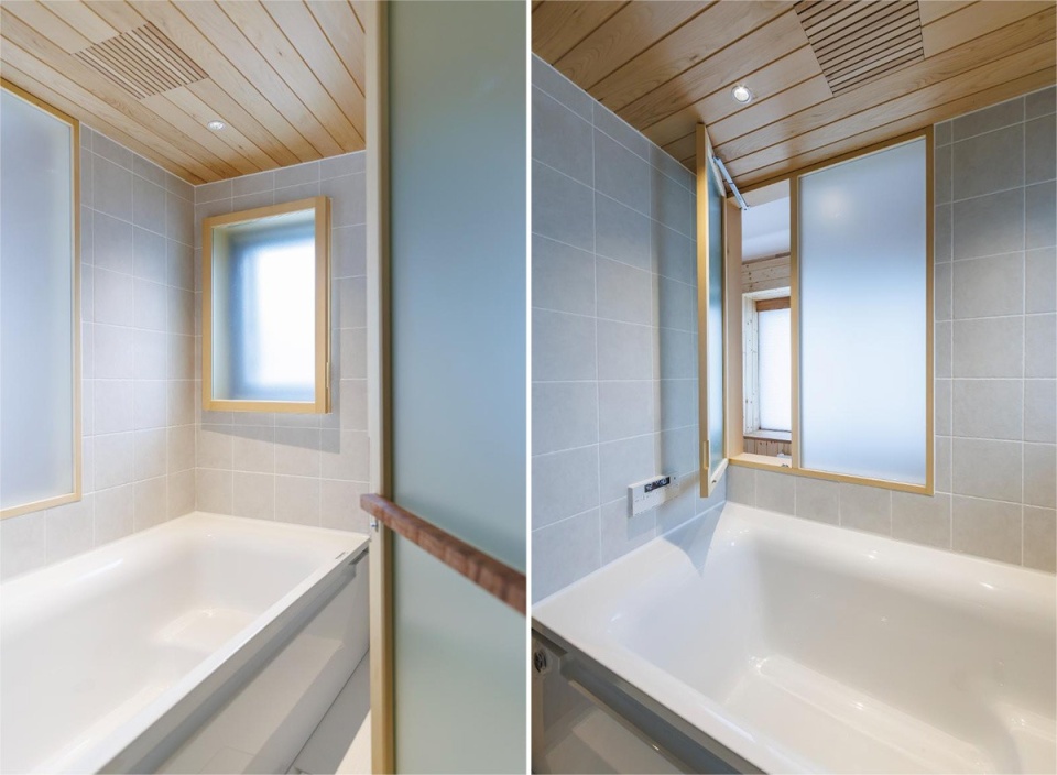 小さな窓を活用し、マンションでは珍しい窓付の浴室には、室内窓も設置しています。これは入浴後の換気対策にもなっています。