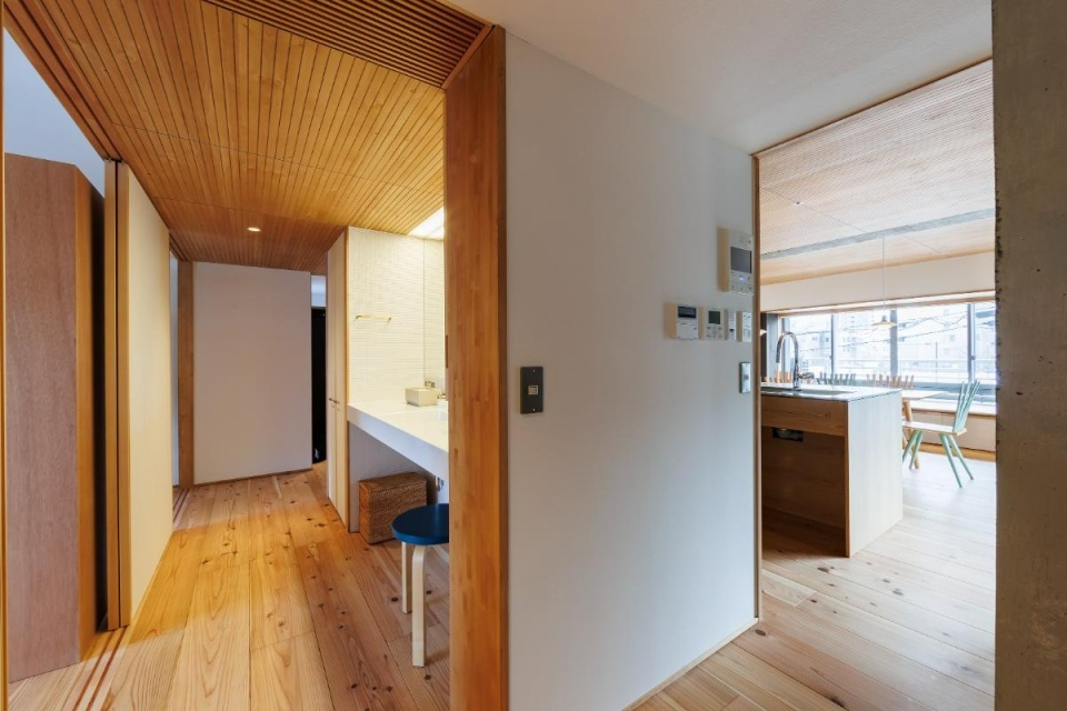 通路を活用した洗面スペースからはダイニング・キッチンに回り込むことができます。