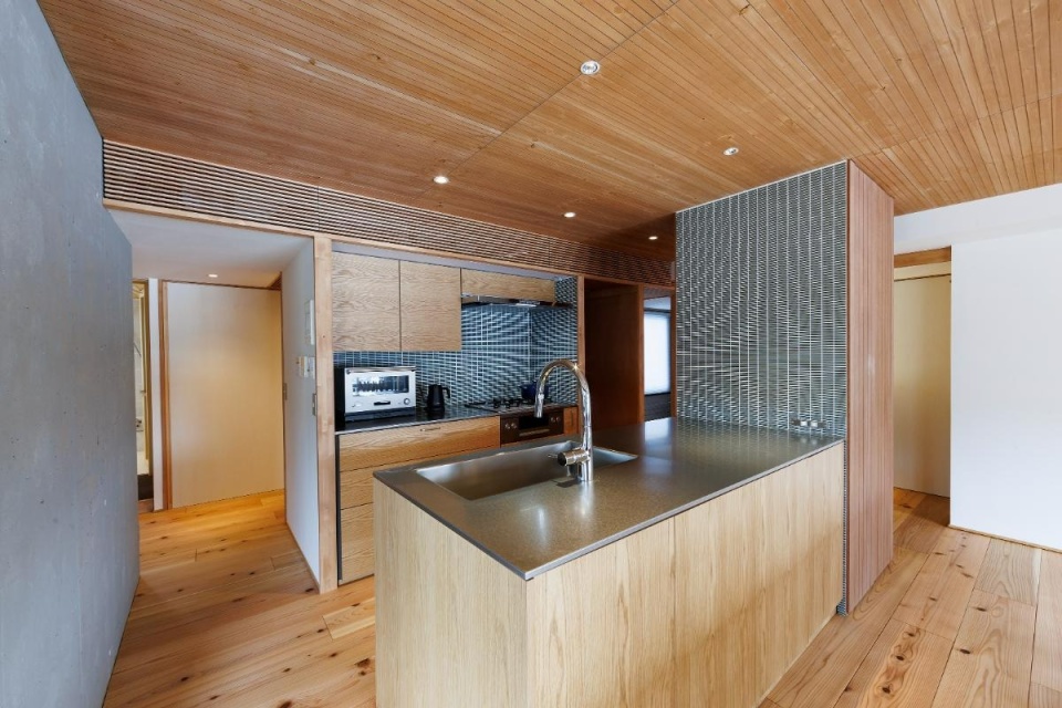 リビング・ダイニングの壁は鉄媒染めしたヒノキを羽目板張りに。渋い風合いが空間を引き締めています。