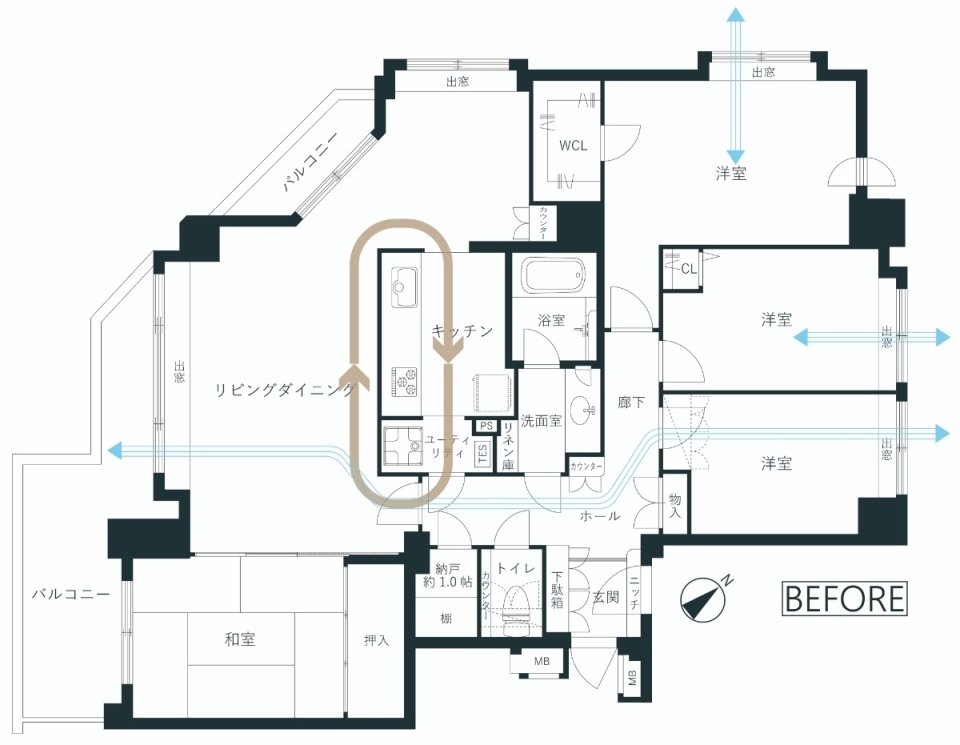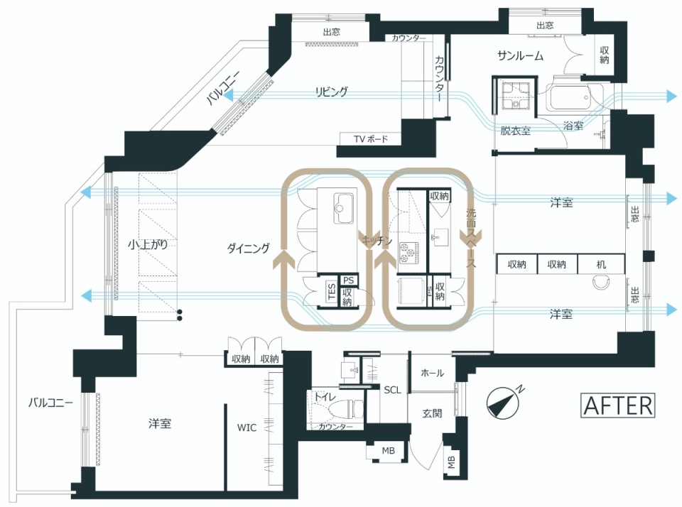 モデルルーム「KiKi」は、キッチンを中心にした回遊動線のある間取りを実現。リノベーション前と比べ、家事動線に加えて生活動線も格段によくなっています。