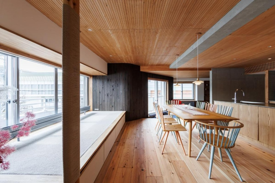 ダイニングの床材には吉野杉無垢フローリングを採用。天井には溝加工し、柿渋で仕上げた道産のトドマツ合板を使っています。