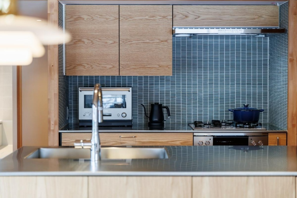 キッチンはステンレス天板を配したクリナップ製のオーダーです。壁にはグリーンベースのタイルをあしらっています。