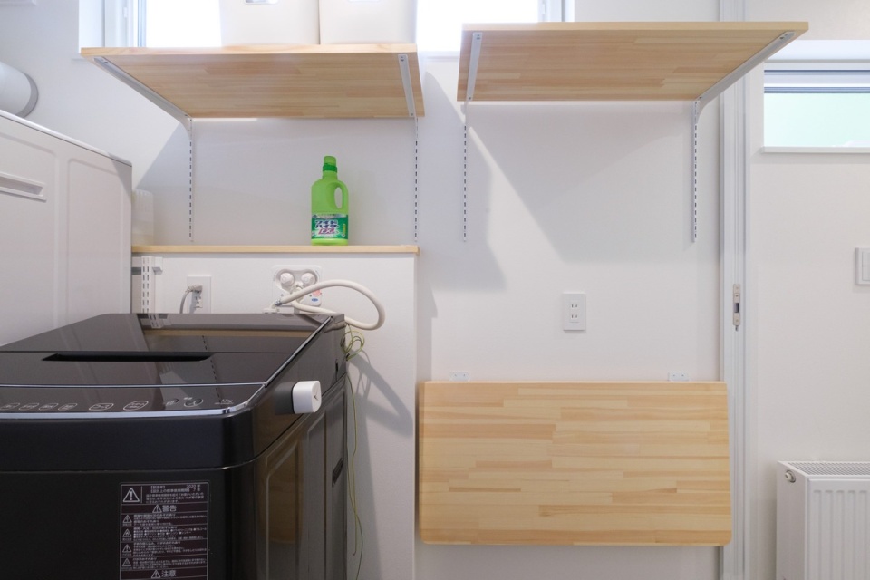 洗濯機の横に、アイロン台としても活用できる折りたたみ式の棚を造作しました。