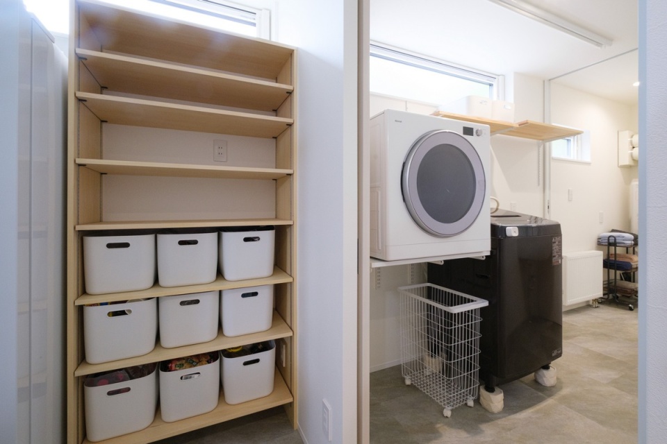 ガス衣類乾燥機『乾太くん』を設置する造作棚の高さは、洗濯機から衣類を移動させやすいように吟味しました。