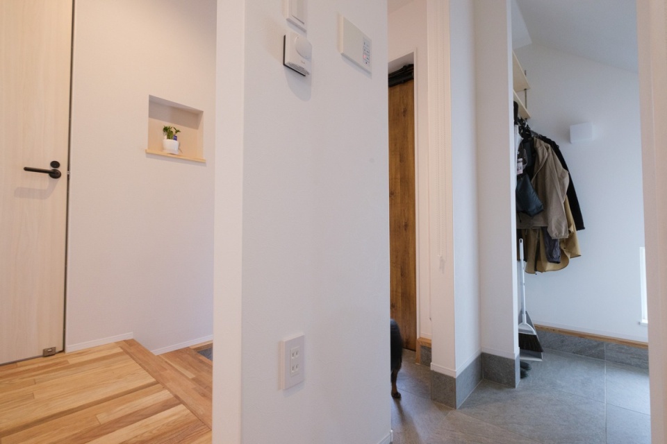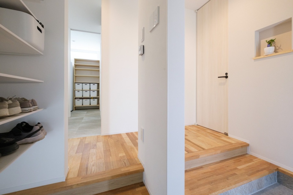 玄関は来客用(右)とシューズクローゼットを備えたプライベート用(左)に仕切りました。