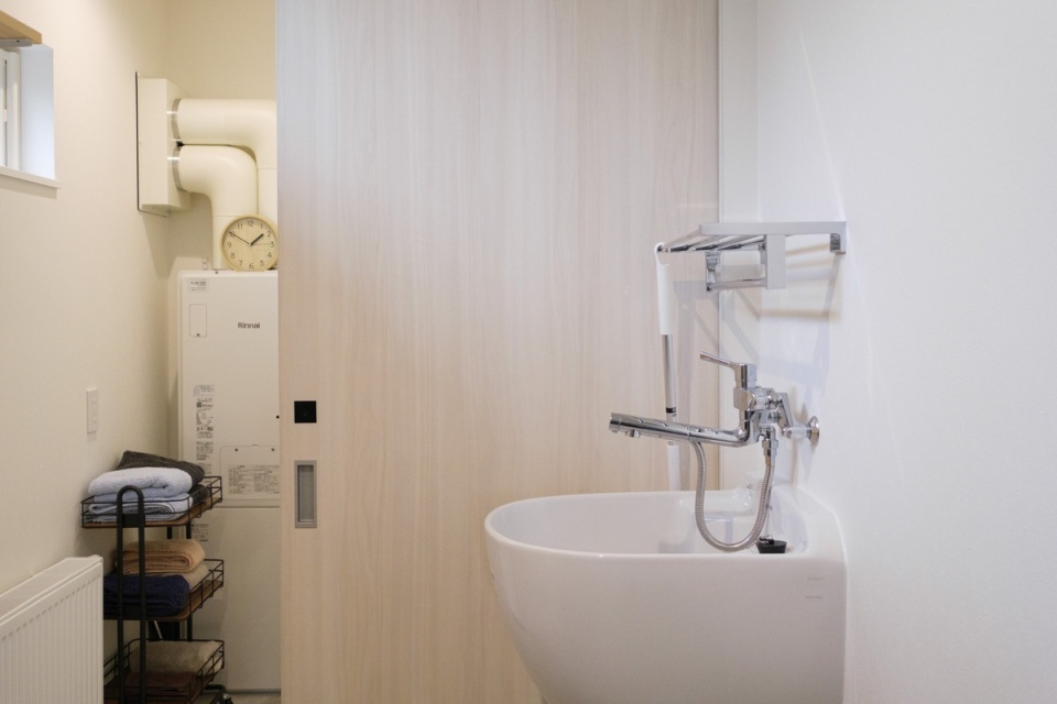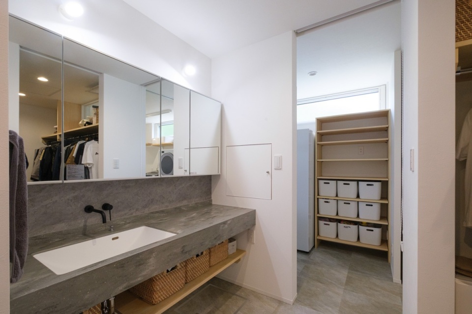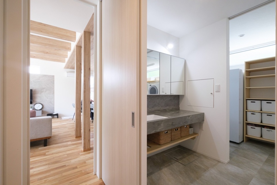 汚れた作業着を洗濯前に予洗いできるスロップシンクは大活躍。洗面室や脱衣室には扉を付け、それぞれの場を家族が同時に使えるようにしています。