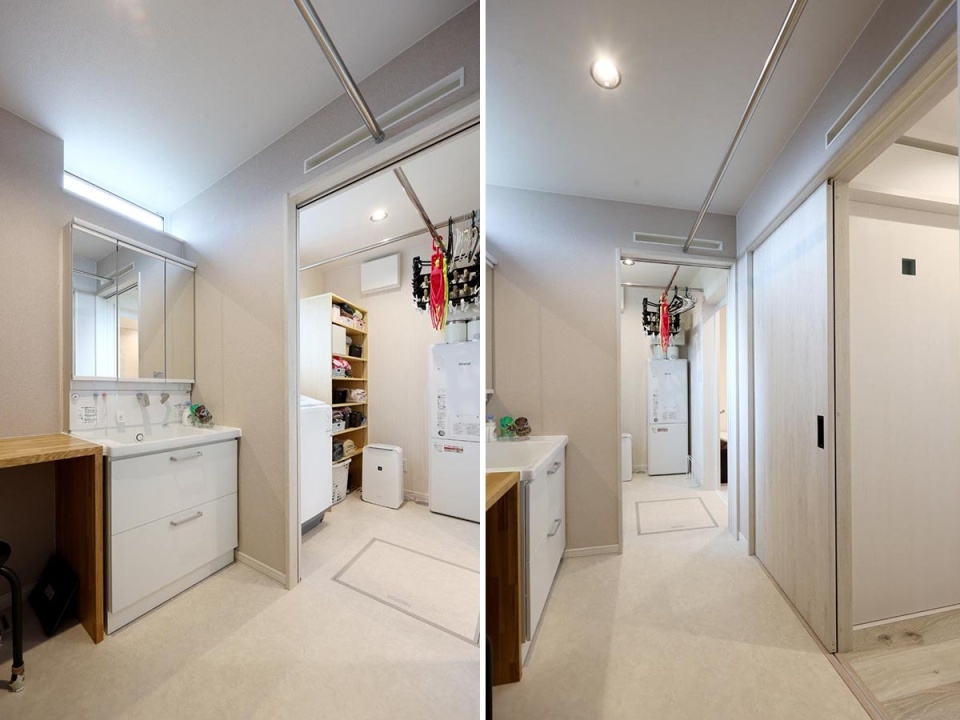 洗面室は、玄関からも出入りできます。洗面室とユーティリティーの天井にはもの干しパイプを渡し、床下収納も付けました。
