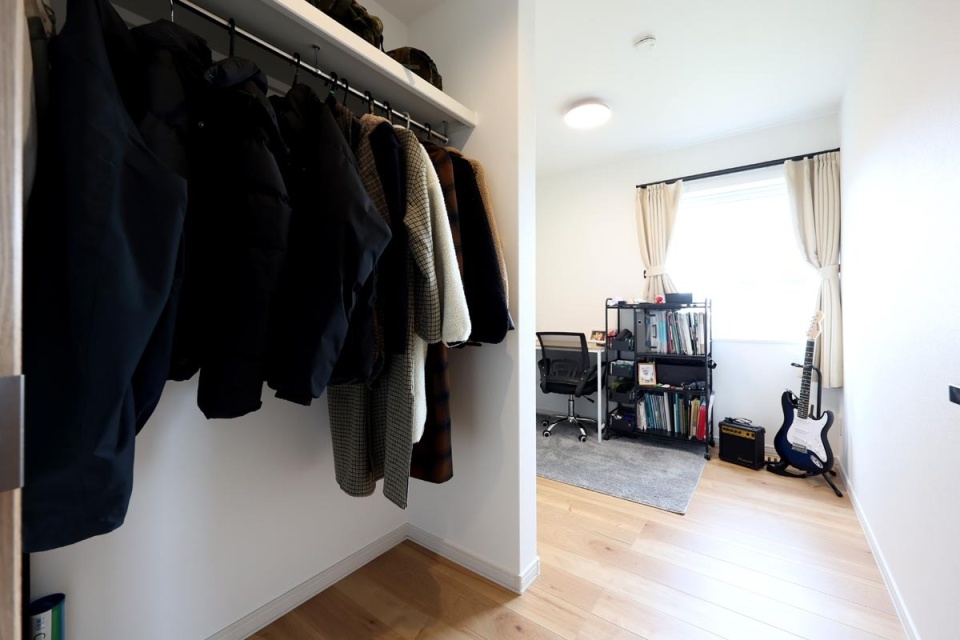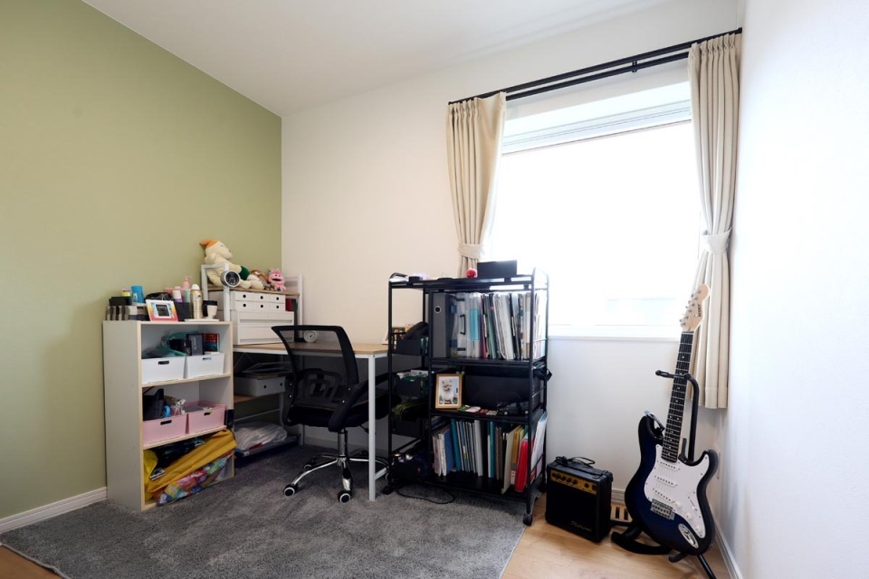 2階洋室の1室は、奥さまが個室として使っています。置かれていたのは買ったばかりのエレキギター。新居で、趣味の世界も広がりました。