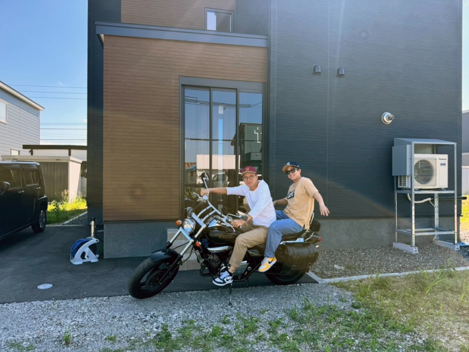 Kさん夫妻はバイクに乗るのが共通の趣味。お客さま担当の今川さんは、K邸の建設時期に普通自動二輪免許を取得し、バイクも購入したそうです。「一緒にツーリングしましょう!」と意気投合している様子に、引き渡し後も続く良好な関係性が見えました。