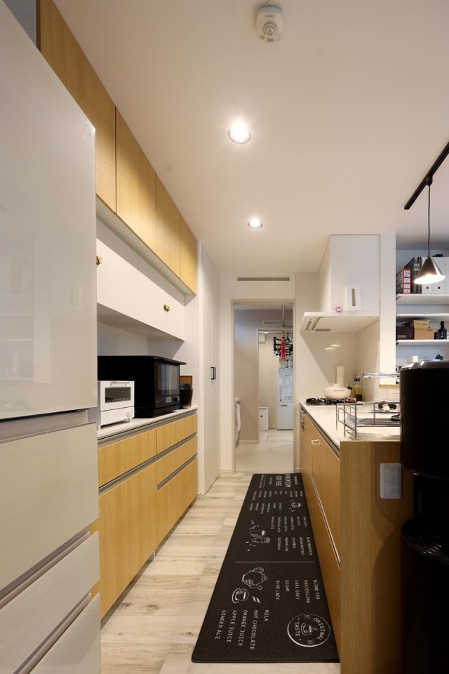 奥さま 1階は回遊式の間取りなので、玄関からキッチンまで食材を運びやすい点が気に入っています。キッチンと洗濯機のあるユーティリティーを直線上に配置したおかげで、帰宅後に食事の仕度や洗濯など、家事を効率よく同時進行できるようになりました。
