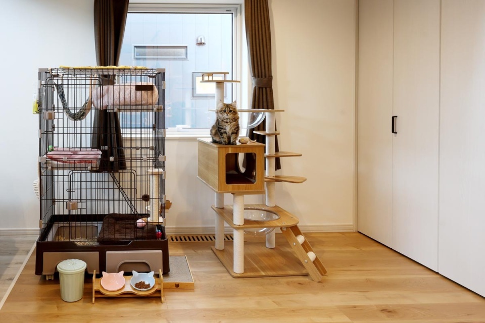キャットハウスがあるフリースペースは、天井からロールスクリーンを下げて個室風に仕切れます。