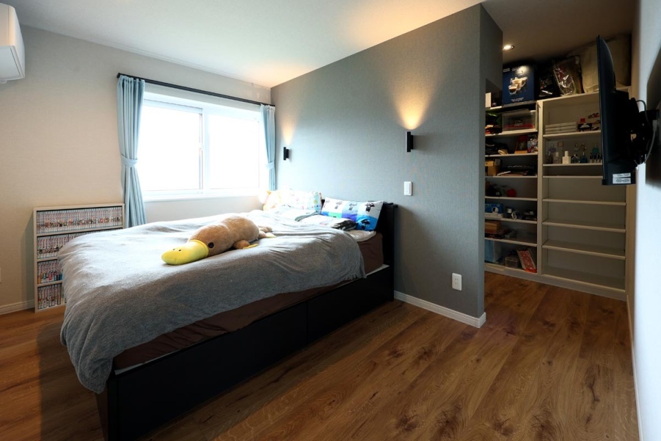 2階寝室には、3帖のWICがあります。手持ちのタンスを活用する寸法で造作棚を造りました。上下に向きを変えられるDAIKOの間接照明は、場所を吟味して取り付けた奥さまのお気に入りです。