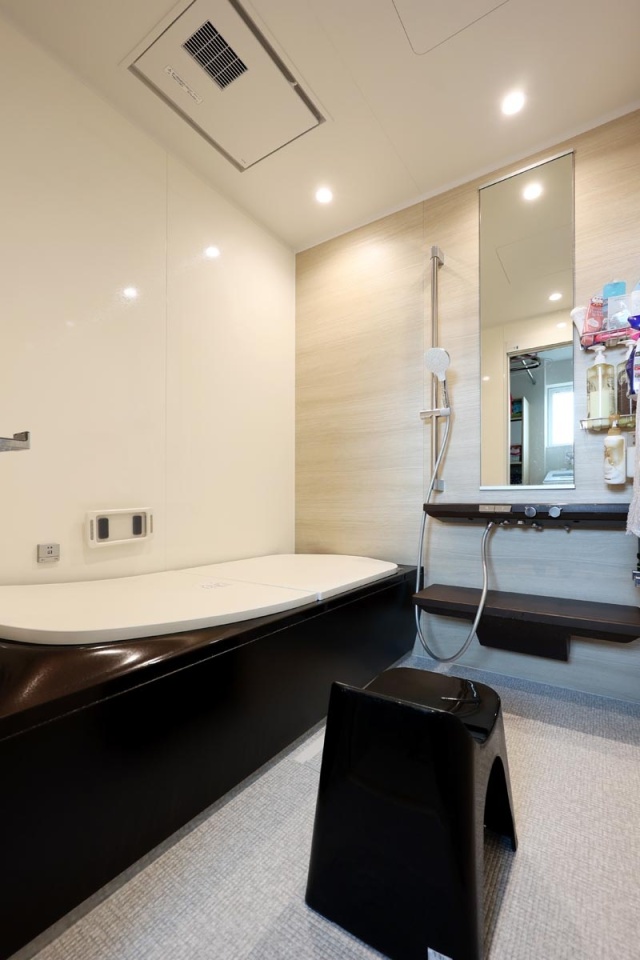 バスタブは、肩を包み込むようにお湯が流れるTOTO製の『シンラ』を採用。クッション性があって柔らかく、足元の冷えを防いでくれる『ほっカラリ床』も、選んでよかったアイテムです。
