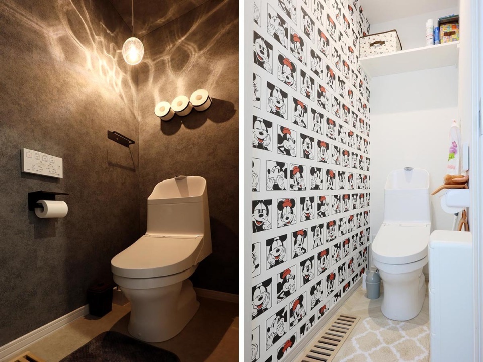 落ち着いたトーンでまとめた1階トイレ(左)は奥さまイチオシのスペース。ガラス製の照明がつくり出す光の模様が素敵です。2階トイレ(右)は、サンゲツのミッキー&フレンズ壁紙を採用してポップなイメージにまとめました。