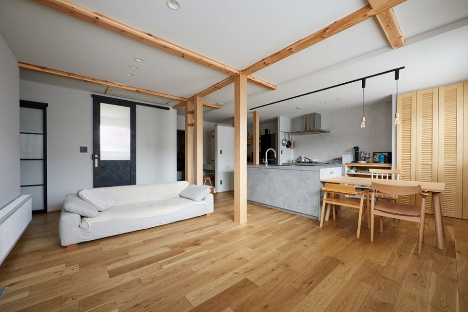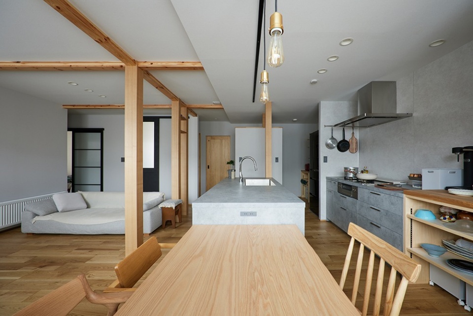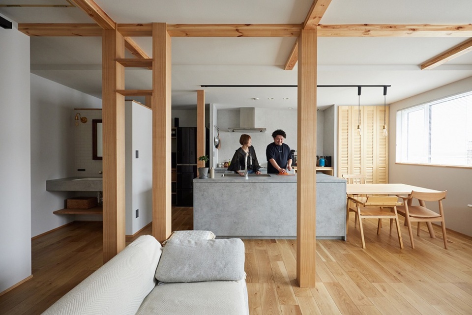 リノベーションのため、撤去できない柱が多くありましたが、天井に施工した化粧梁と組み合わせ、空間になじむようにデザインしてもらいました。三五工務店は木や鉄、石といった自然素材を組み合わせた家づくりを得意としていて、その点も依頼した理由の一つです。