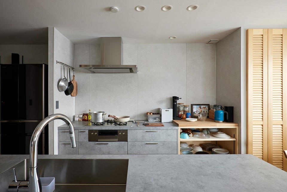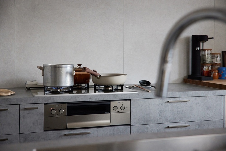 キッチンは、キッチンハウス製のGRAFTEKT(グラフテクト)。石目調の天板やキャビネットがスタイリッシュな印象です。