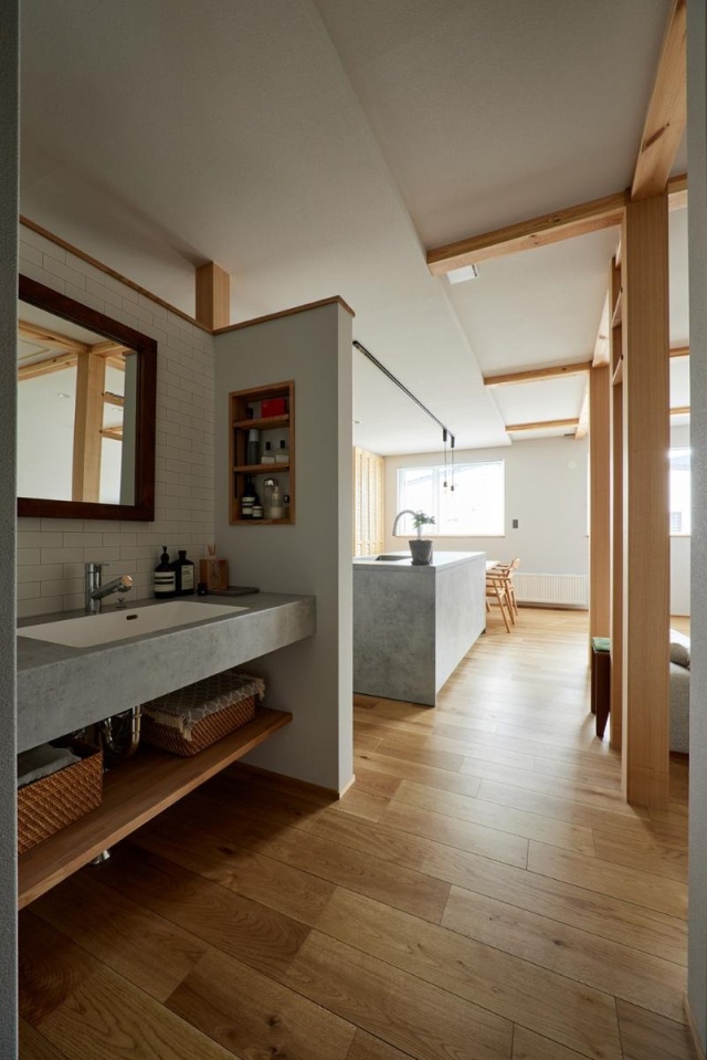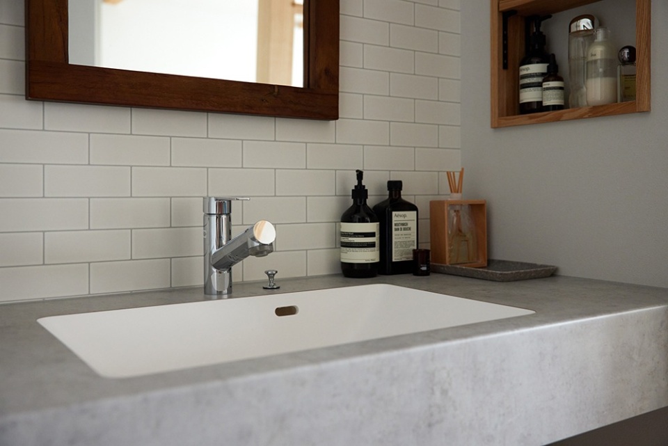 洗面化粧台は独立させ、リビングから直接視界に入らないよう、袖壁を設けました。洗面化粧台はキッチンの天板やキャビネットと同じ石のテイストで揃えています。