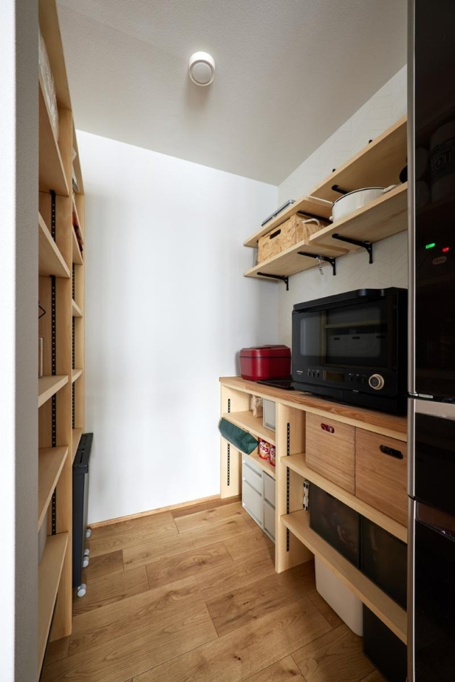 洗面の裏側、キッチンの奥にあたる場所がパントリーで、調理家電も置いています。洗面と仕切り壁上部は閉塞感のないよう開けています。