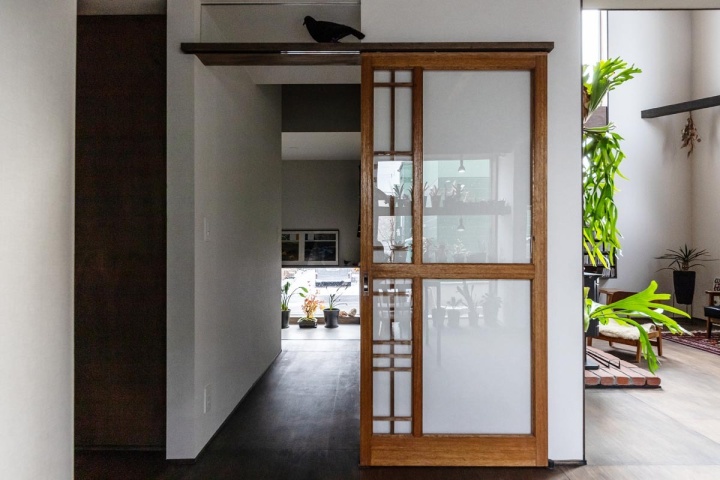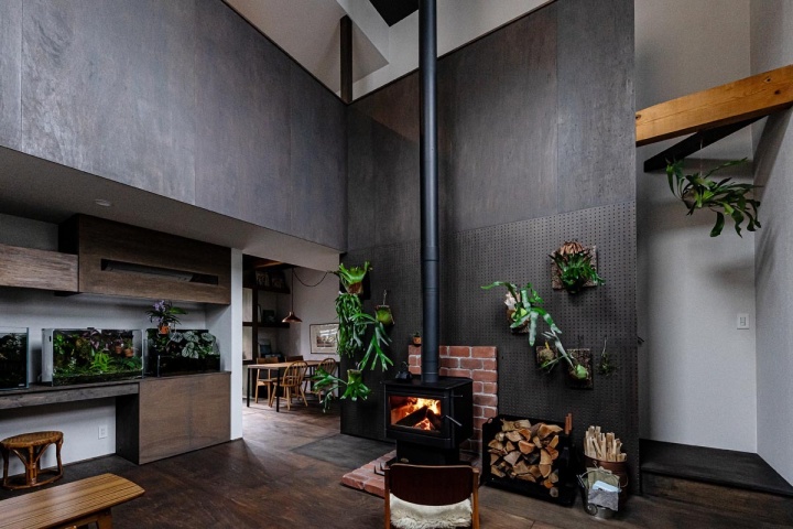観葉植物やアクアリウムのための造作棚や、有孔ボードによる植物ハンギングスペースを設けることで、趣味が日常に自然と溶け込むよう計画しています。経年変化した梁や建具、テーブルも取り入れ、感覚的にも身体的にも“ちょうどよい”心地よさを追求しました。