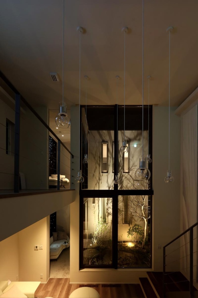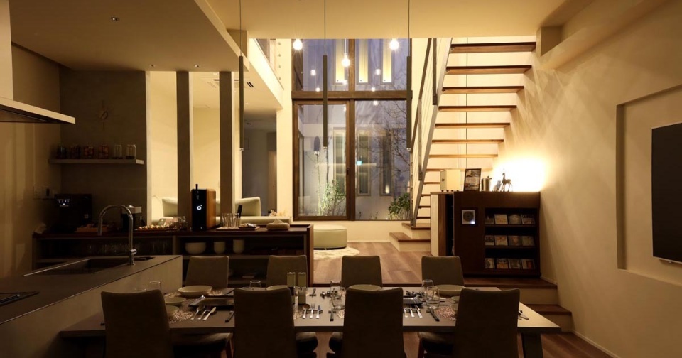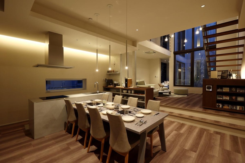中に入るとすぐにダイニング・キッチンが、その先にスキップフロアの吹き抜けリビングが続いており、中庭に面した大開口から視線が抜け、縦横に広がりを感じさせる設計です。