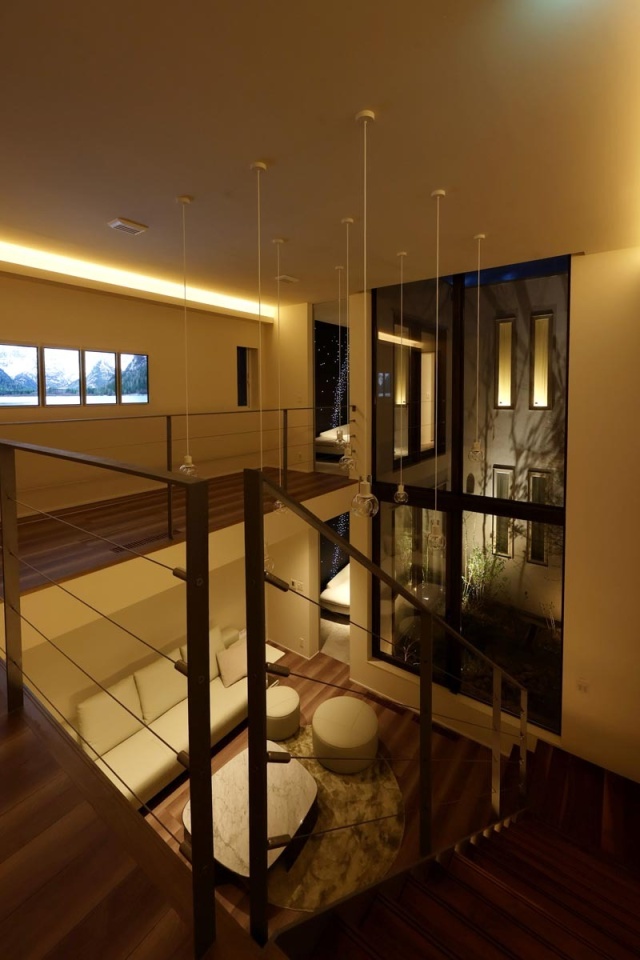2階につながる吹き抜け階段からの眺め。ホールの壁面のバーチャルウィンドウは水景と対比した遊び心を感じさせる演出です。
