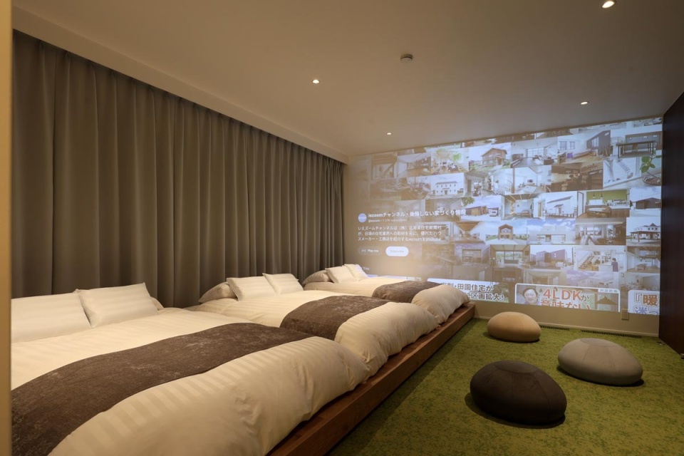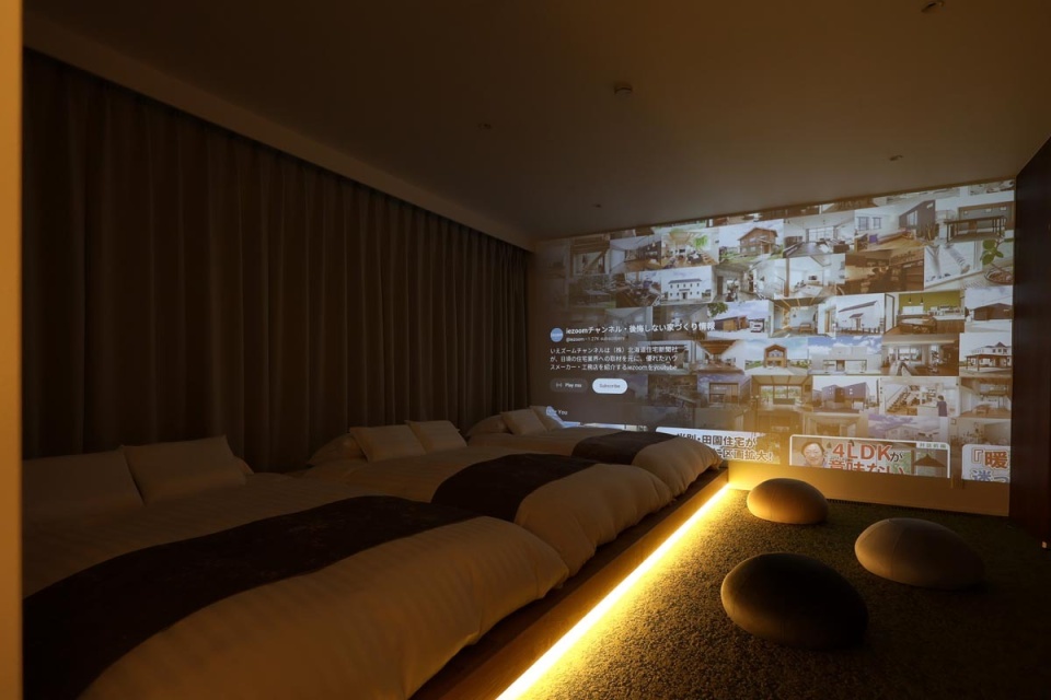 2階には1階と同じ仕様のベッドルームのほかに、こちらの子ども部屋をプラン。壁一面に映し出したプロジェクターで、ゲームや動画を楽しめ、芝生をイメージした床の上で思い切り遊べる空間です。