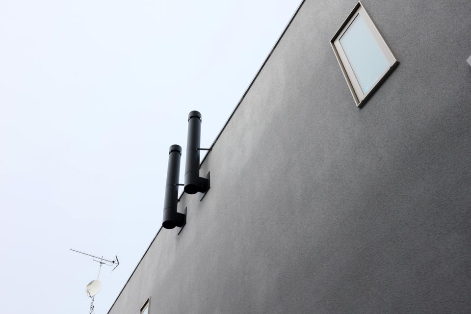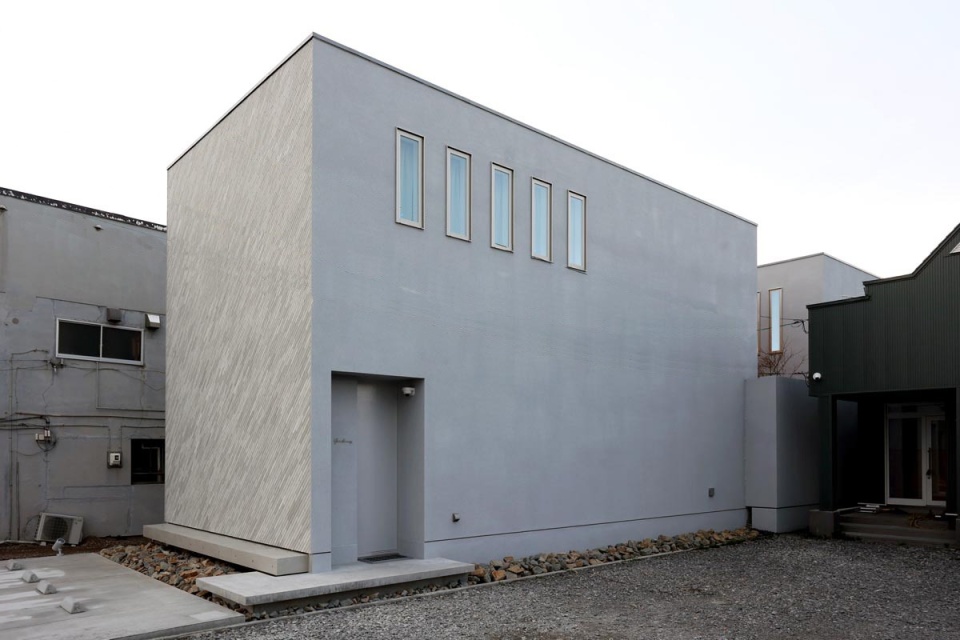 ヴィラは交通量の多いロードサイドに建っています。プライバシーを守る窓の配置。シンプルでスタイリッシュな外観です。外壁タイルは星の街としても有名な余市町にちなみ、流れ星をイメージした斜め貼りのデザインです。