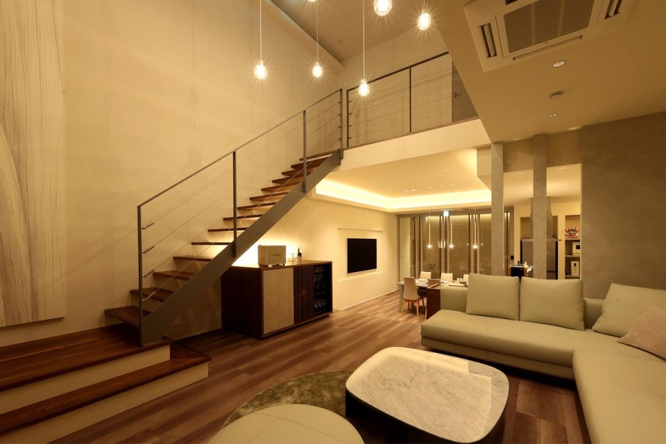 上下階がオープンにつながる吹き抜けリビングには、オーダーしてつくったL字型の大型ソファとコーヒーテーブルが。階段下はミニバーになっています。