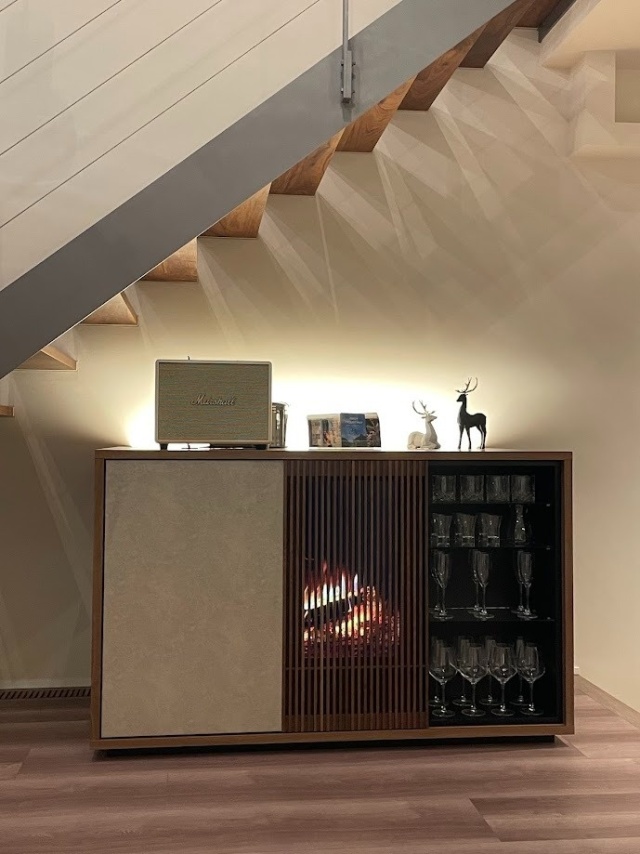 ミニバーのサイドボードはオーナー自らがAtmoph Window(アトモフ社が提供するバーチャルウィンドウ)を設置。薪ストーブのイメージ動画とBGMが流れ、空間をよりムーディーに演出しています。