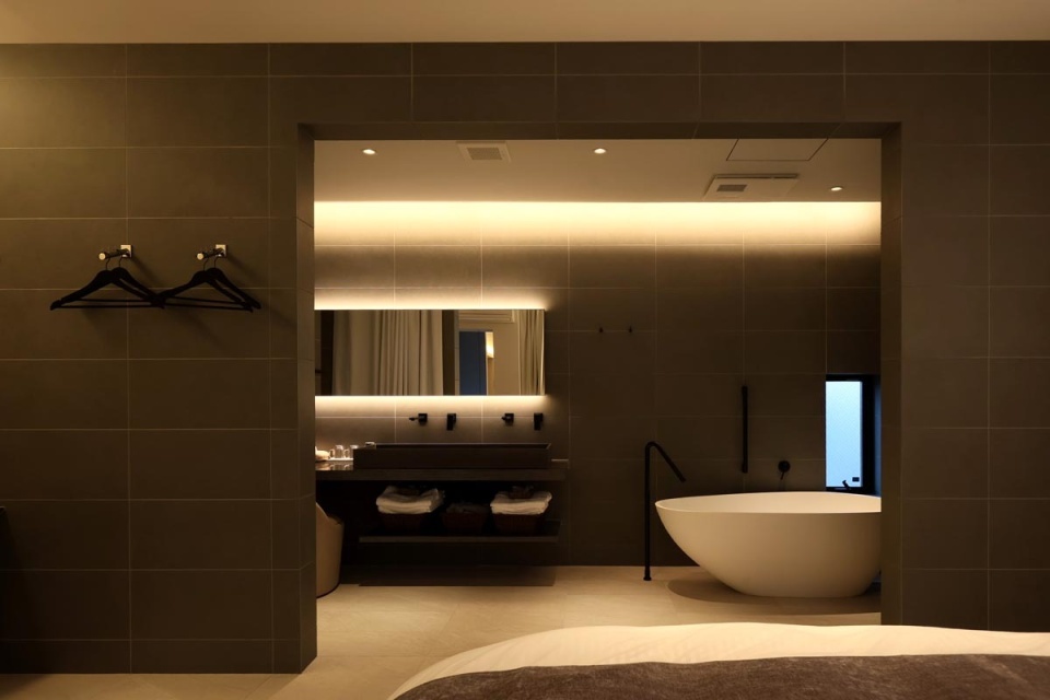 例えば、マスターベッドルーム。オープンで一体感のある空間にするために、浴室と寝室の間には、排水口はあるものの仕切りを付けず、フラットな床続きにしています。