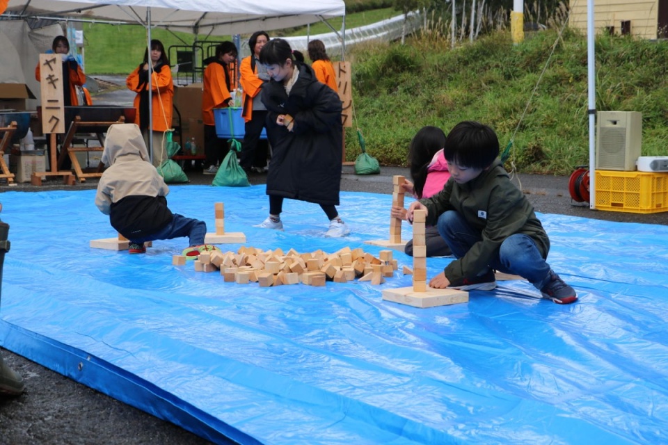 子どもたちは積み木の積み上げ対決で勝負。途中で崩れたり、風で倒れたりと、ハラハラ・ドキドキが最後まで続く、運も味方につけたいゲームです。