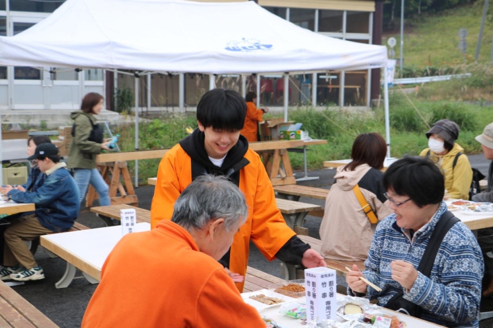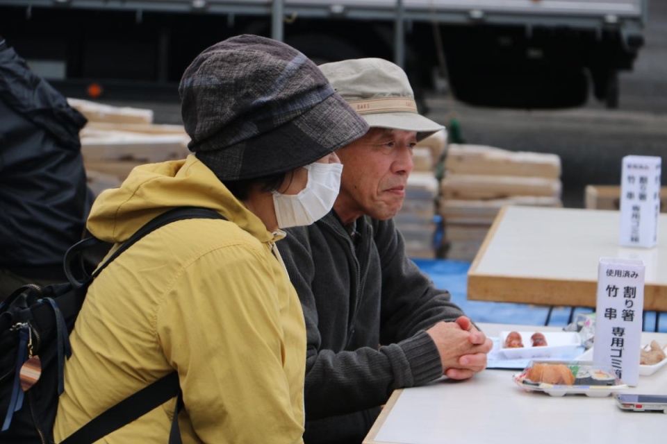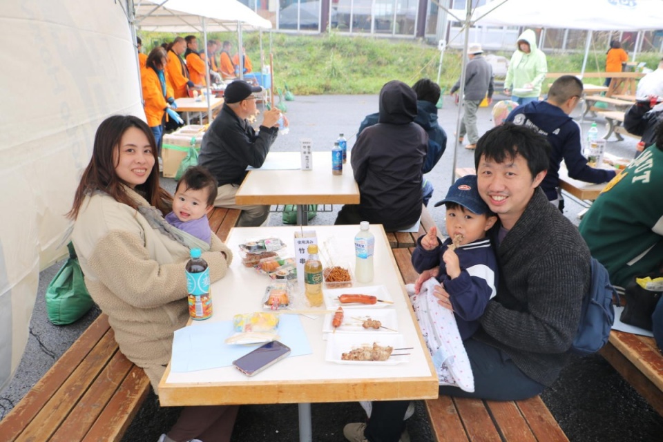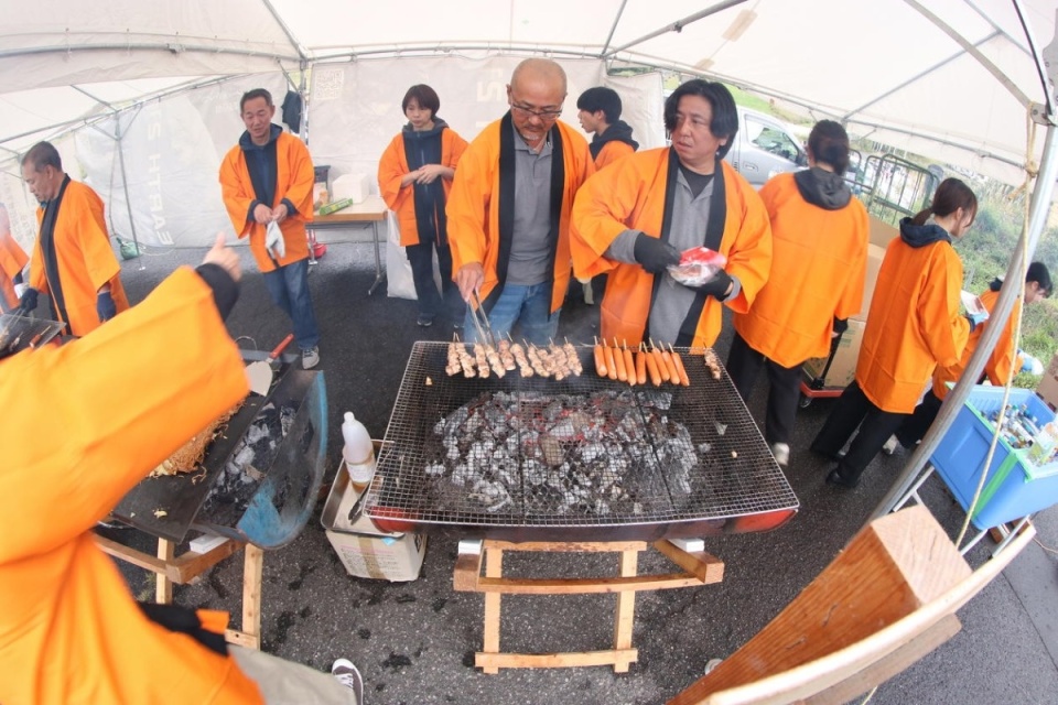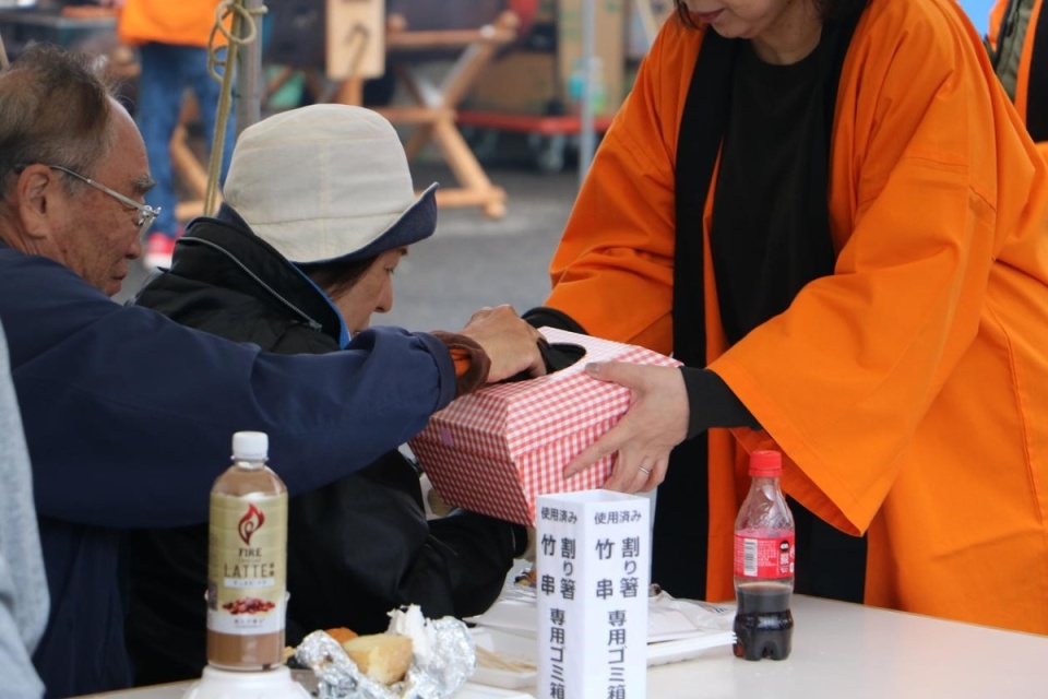 コロナ期に開催を見送り、約5年ぶりとなったお客様感謝祭。当日は瀧本ホームのスタッフ・大工・関連業者が総出で、串焼きなどの出来立てフードやドリンク、寿司折などを準備してお客様をお迎えしました。オレンジ色の揃いの法被姿でテンションも上がります。