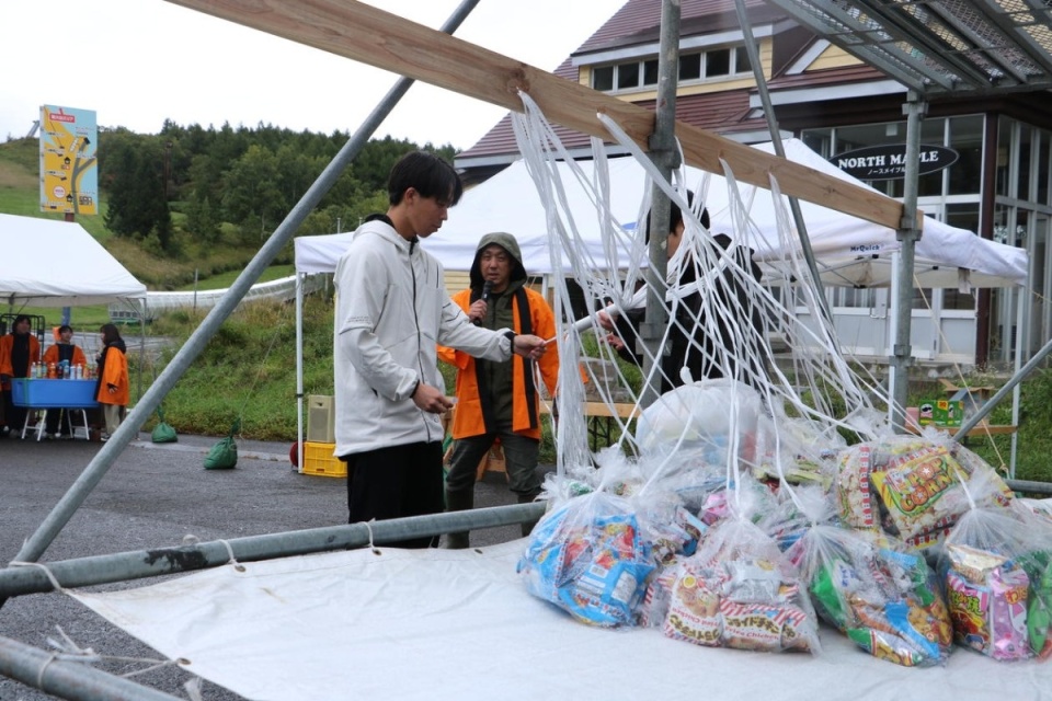 当初はお菓子まきを予定しており、やぐらが建てられましたが、この日は終始雨混じりのお天気。機転を利かせてお菓子まきは袋に詰められた紐付きくじに変更されました。これがまた大いに盛り上がります。