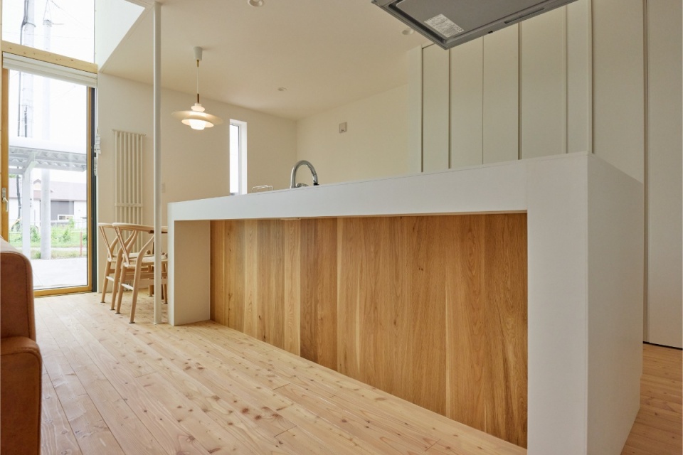 カウンター下は配色のバランスをみて木目柄のパネルを採用しました。実用的な場であるキッチンとくつろぎの空間であるリビングをつなげるナチュラルなデザインはオーナーご夫婦のお気に入り。市販のアイランドキッチンよりも低予算で実現したのも嬉しいポイントです。