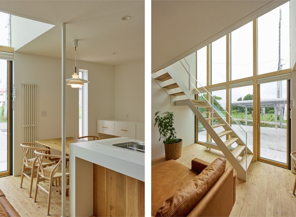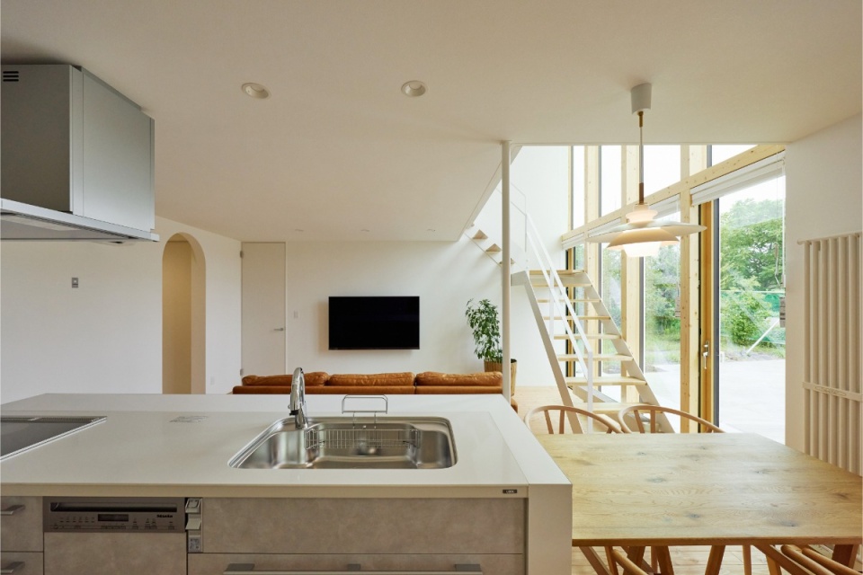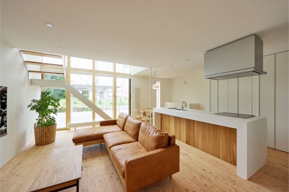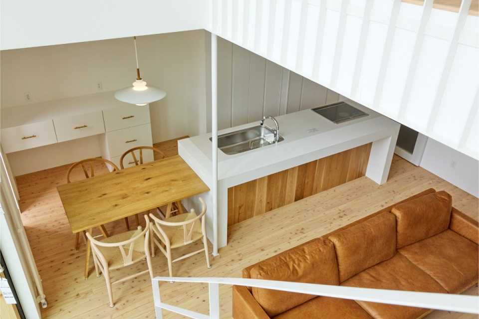 リノベ前は玄関ホールにあった階段をLDK内に移動し、南面には吹き抜けを設けて景観を生かした明るい空間に。