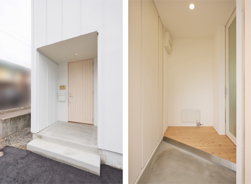 ノルド社製の玄関ドアは欧州アカマツ材を使用したもの。玄関の上がり框にはステンレス素材を採用し、温かみがありながらスタイリッシュな印象です。