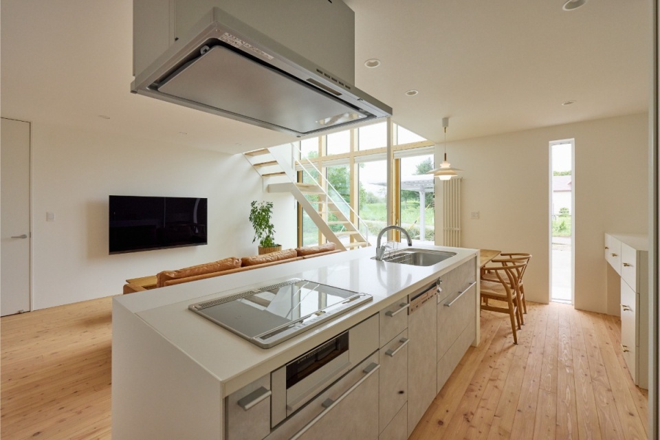 こちらのキッチンもそのひとつ。壁付用のシステムキッチンにフラットなカウンターを加え、アイランド型に仕上げました。