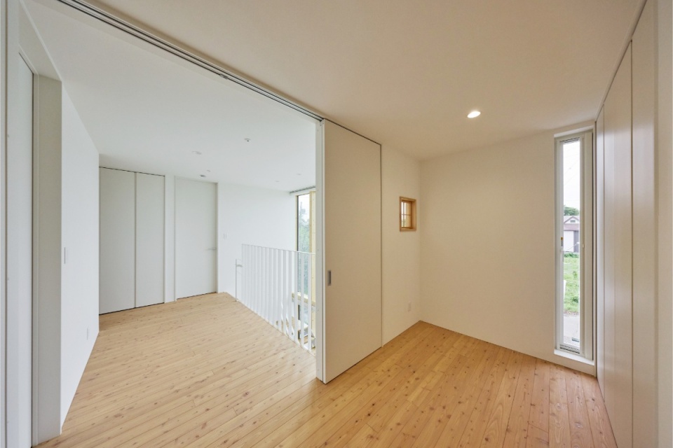 ゲストルームを兼ねた書斎の引き戸は室内に収納できる造り。ホールと連続した大空間としても活用できるよう設計されています。